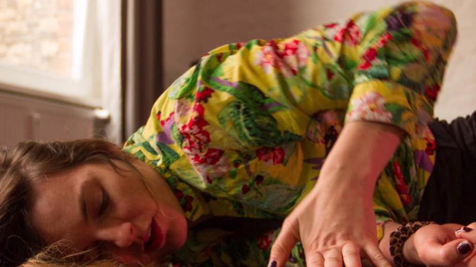 Carolin Hartmann bei einer Performance. Sie ist im Halbporträt zu sehen, vom Kopf bis zur Hüfte. Sie liegt auf dem Boden, der linke Arm ist angewinkelt, die linke Hand mit gespreizten Fingern ist auf dem Boden aufgestützt.